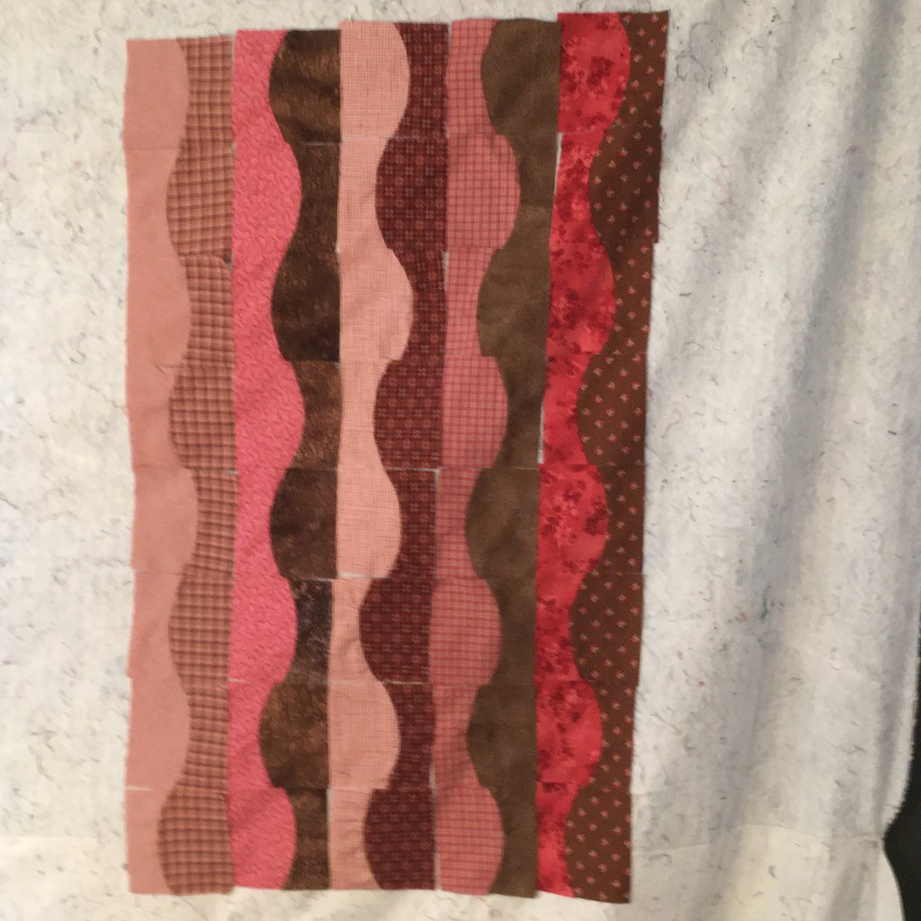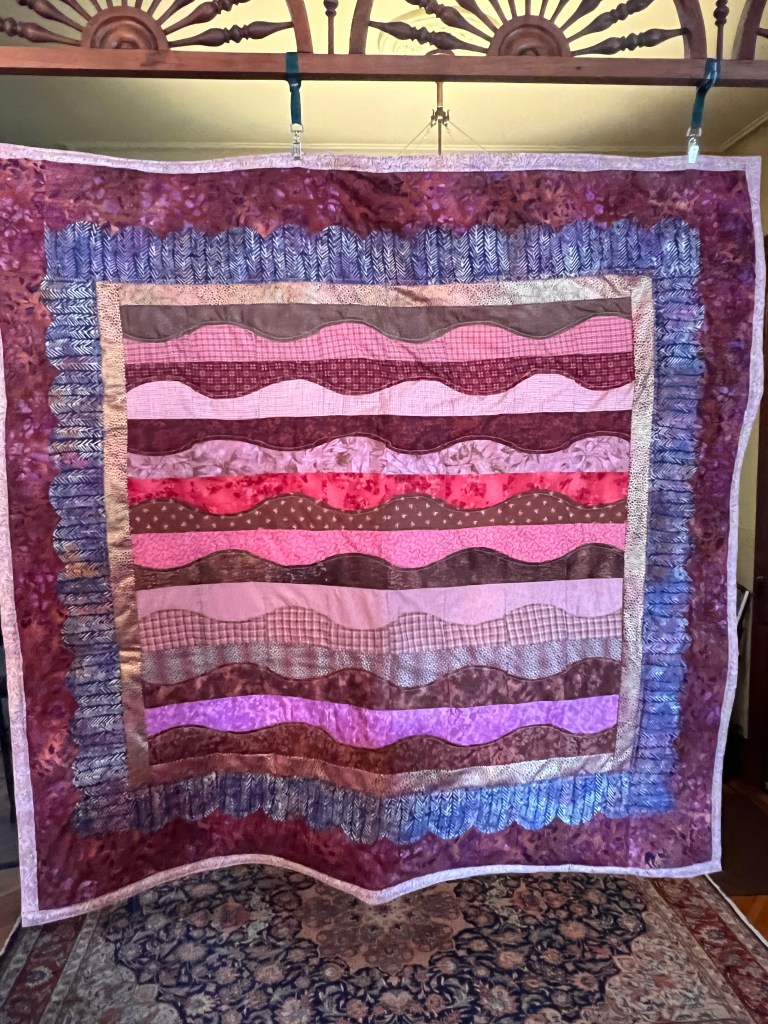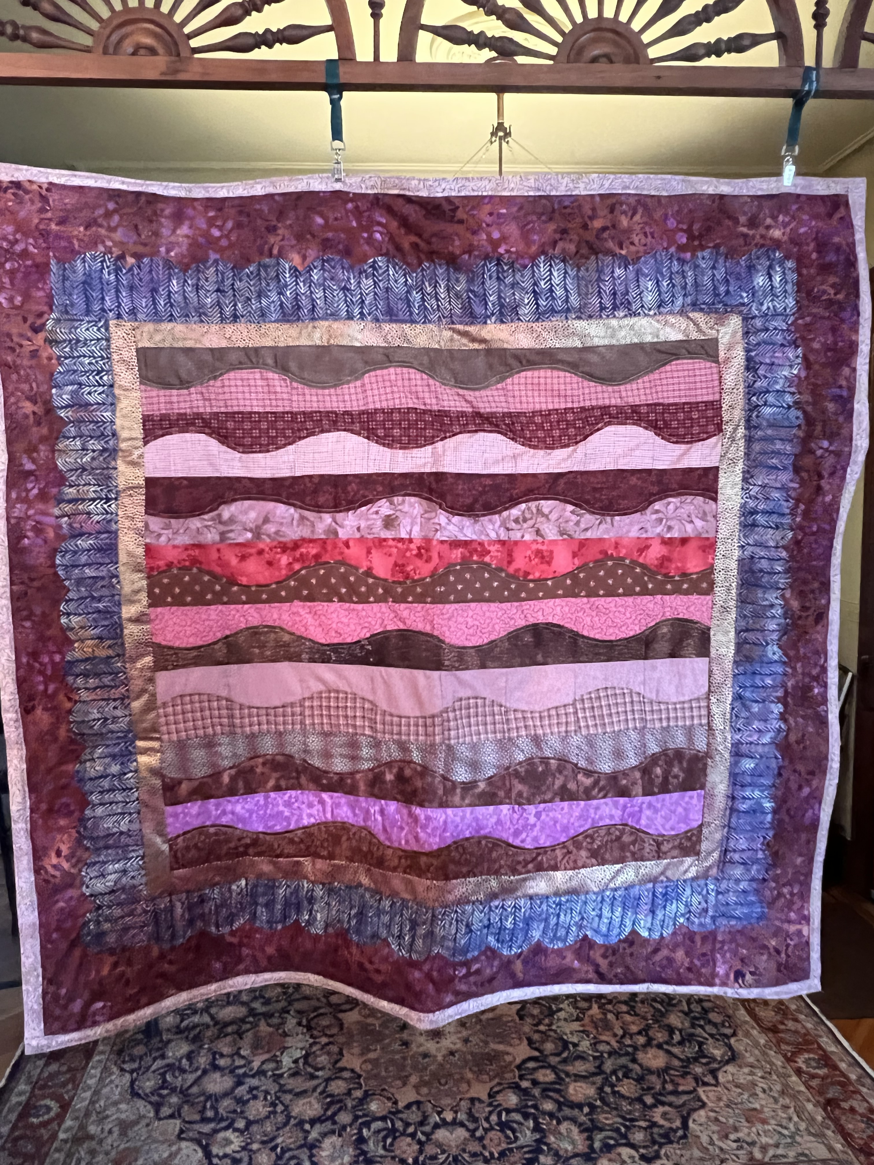 With a new set of small rulers I purchased at a quilt show, I worked with a warm palette of strawberry and chocolate. The curved pieces came together smoothly, and the rows made lovely waves. I scalloped the edges for a dramatic frame. A pretty wall hanging.