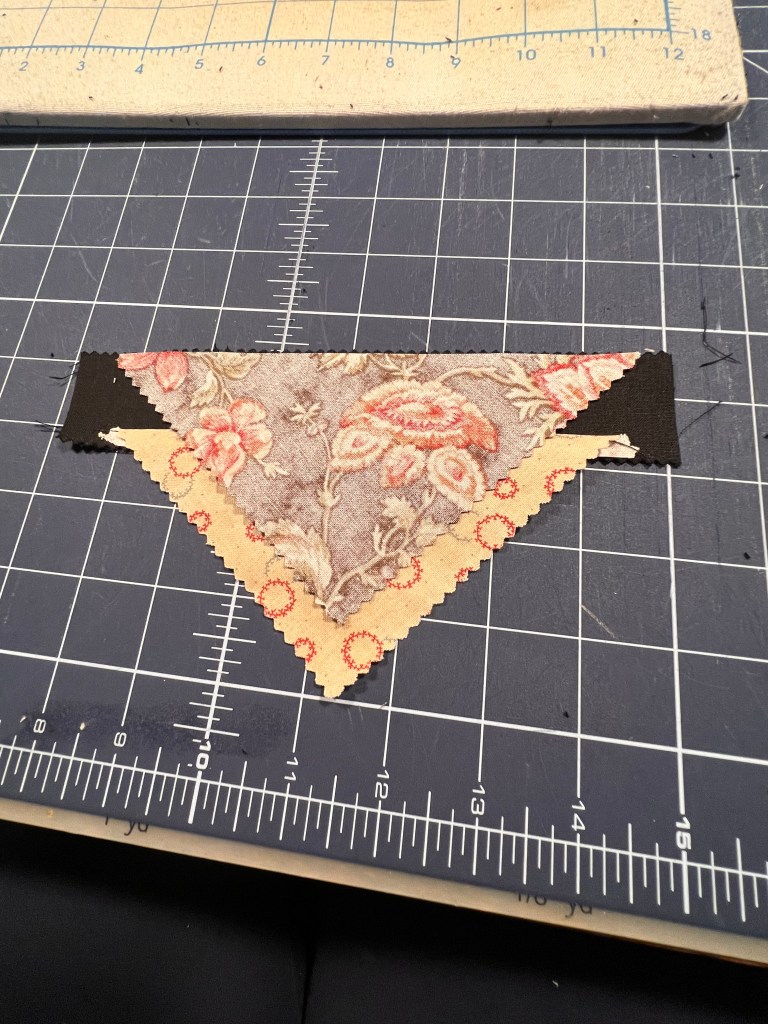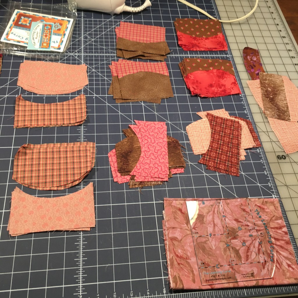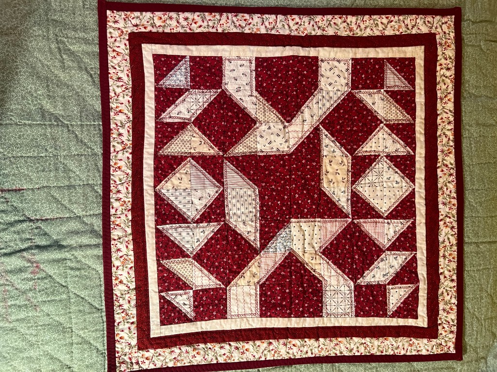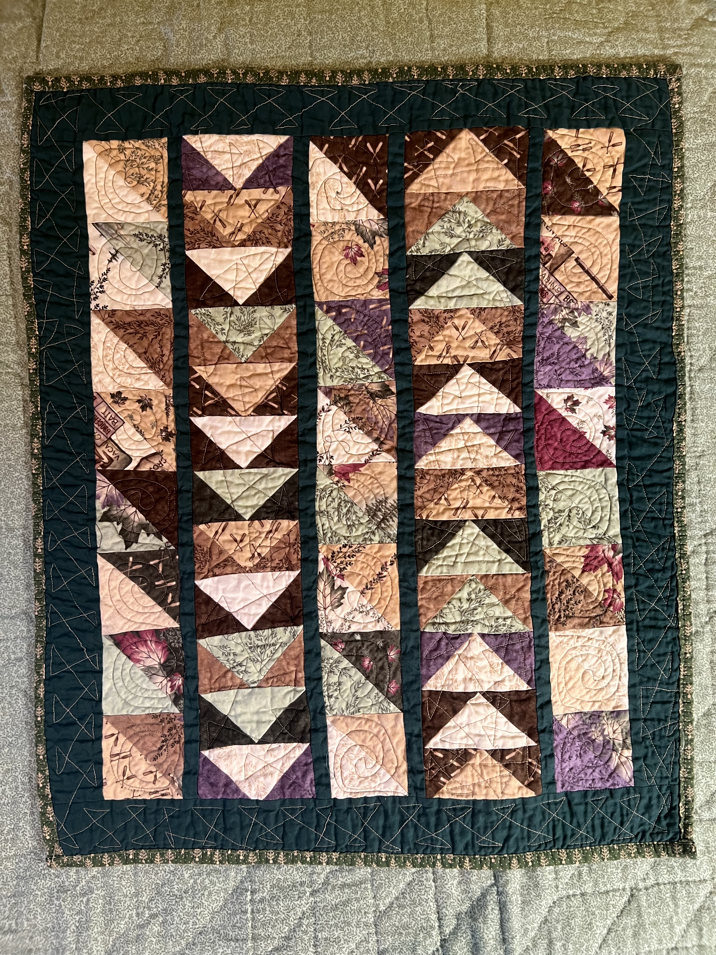 With a new set of small rulers I purchased at a quilt show, I worked with a warm palette of strawberry and chocolate. The curved pieces came together smoothly, and the rows made lovely waves. I scalloped the edges for a dramatic frame. A pretty wall hanging.