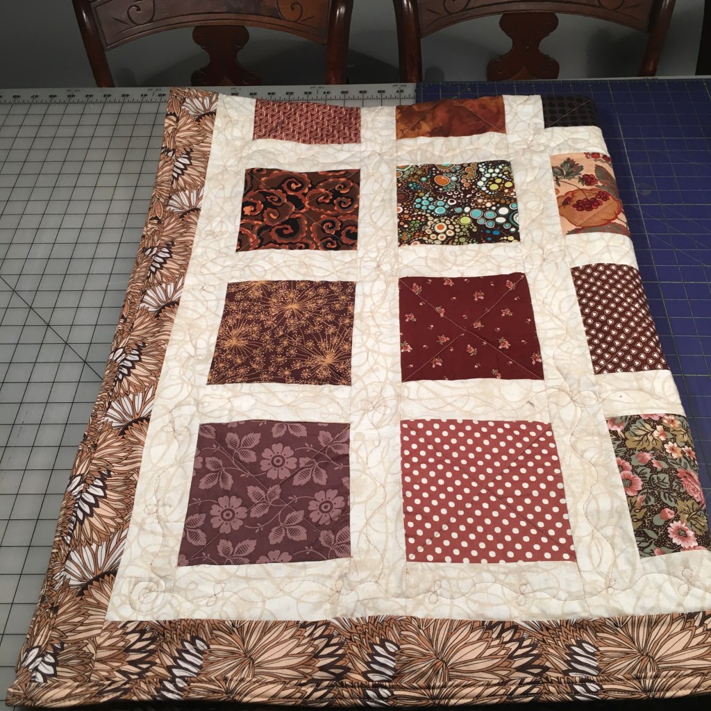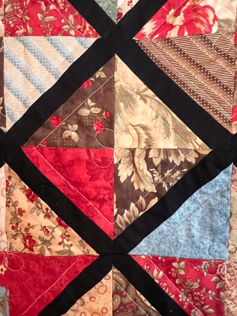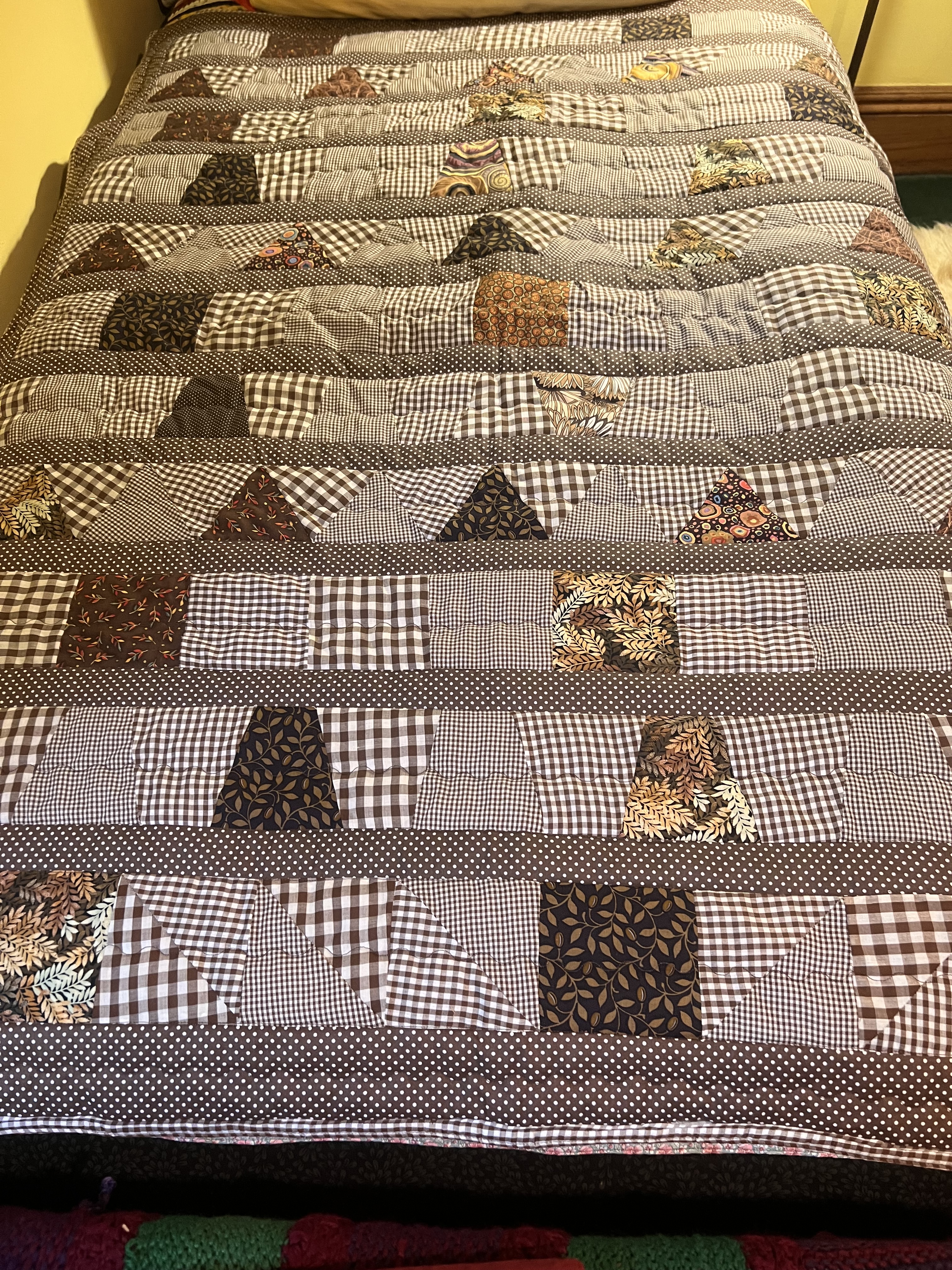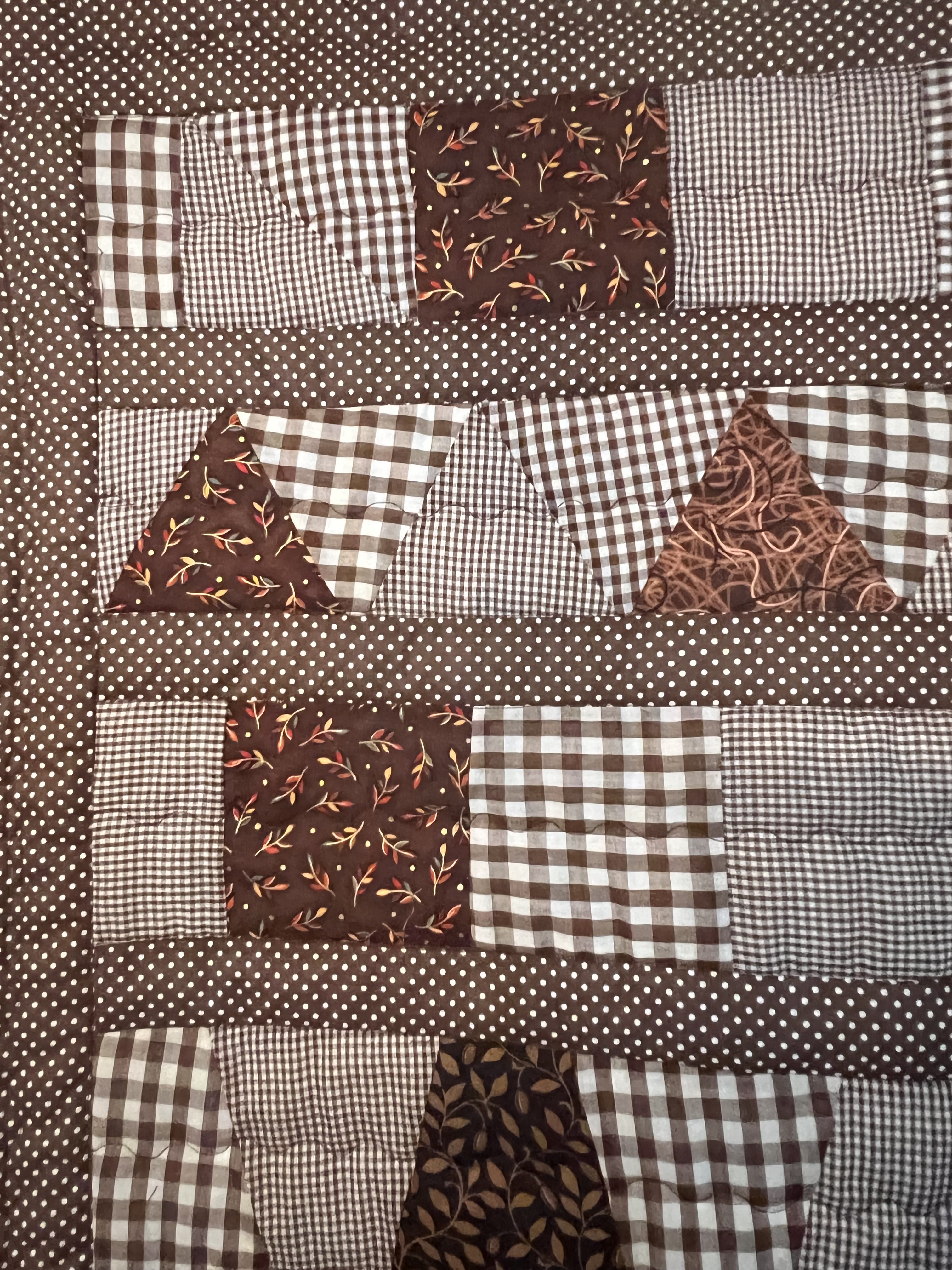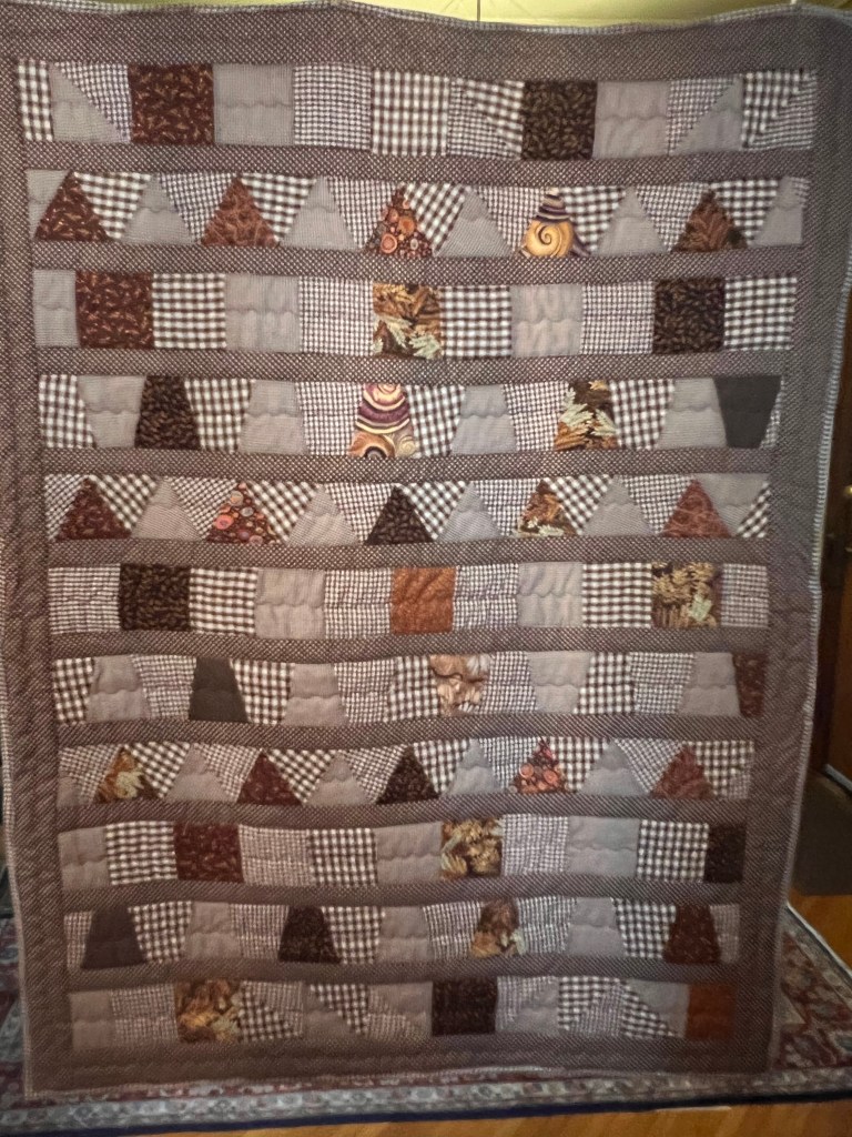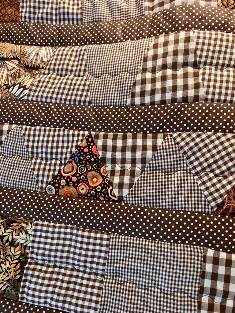 I had purchsed yardage of three scales of a brown gingham fabric on e-bay; they looked so appealing, but for years I didn’t know what to do with them. Finally, I bit the bullet, and decided to cut squares, tumblers and triangles, and see how they might fit together. By themselves, they had no life, so I pulled many brown prints from my stash, and added them to the mix. Now I had something I could work with. The soft, comfortable quilt that resulted is a quiet charmer.