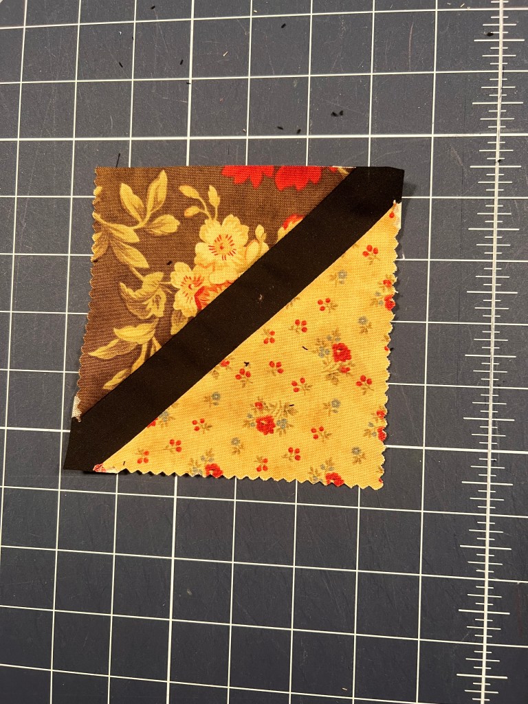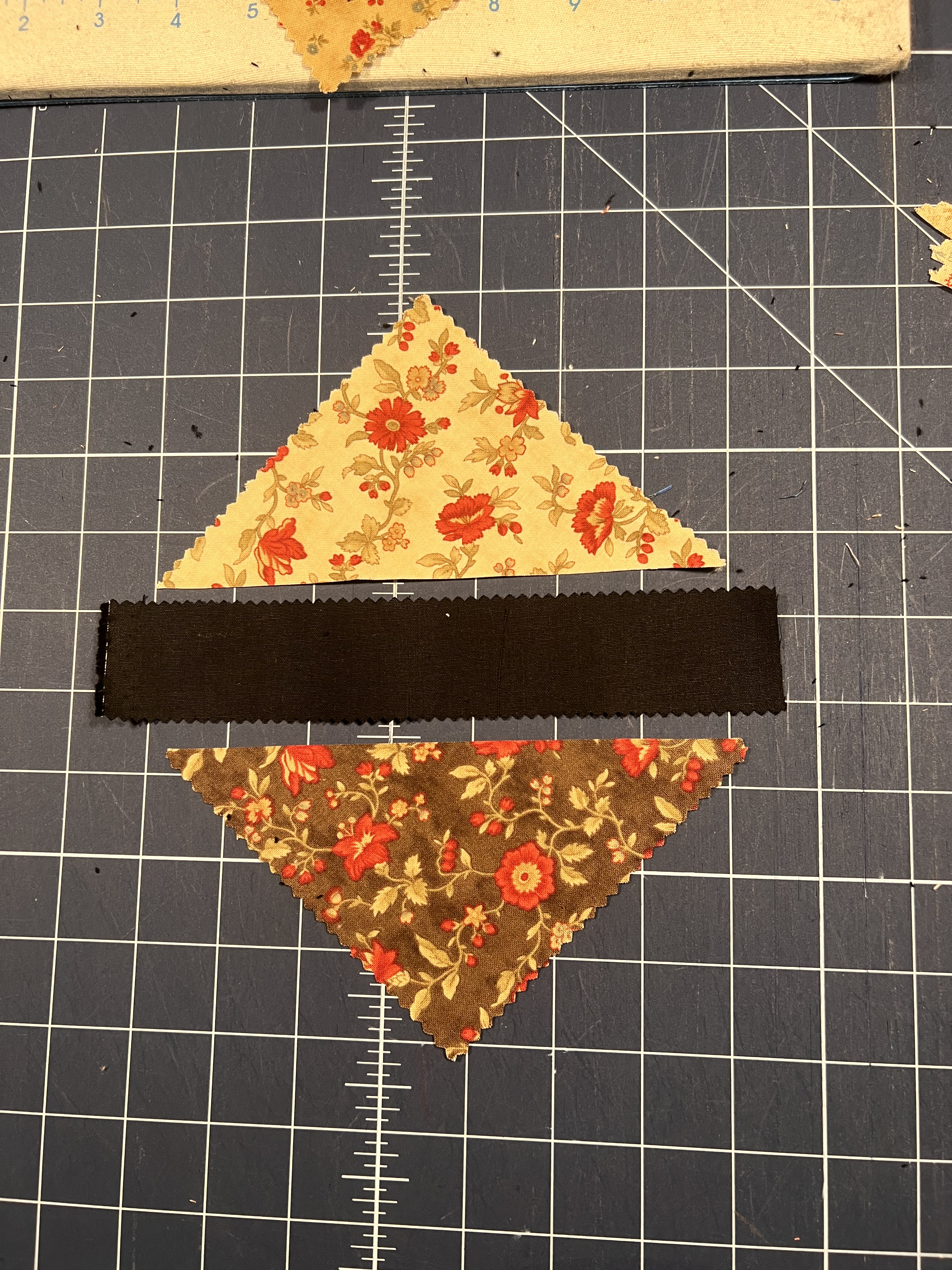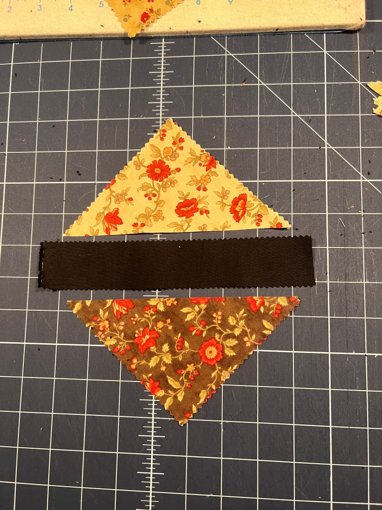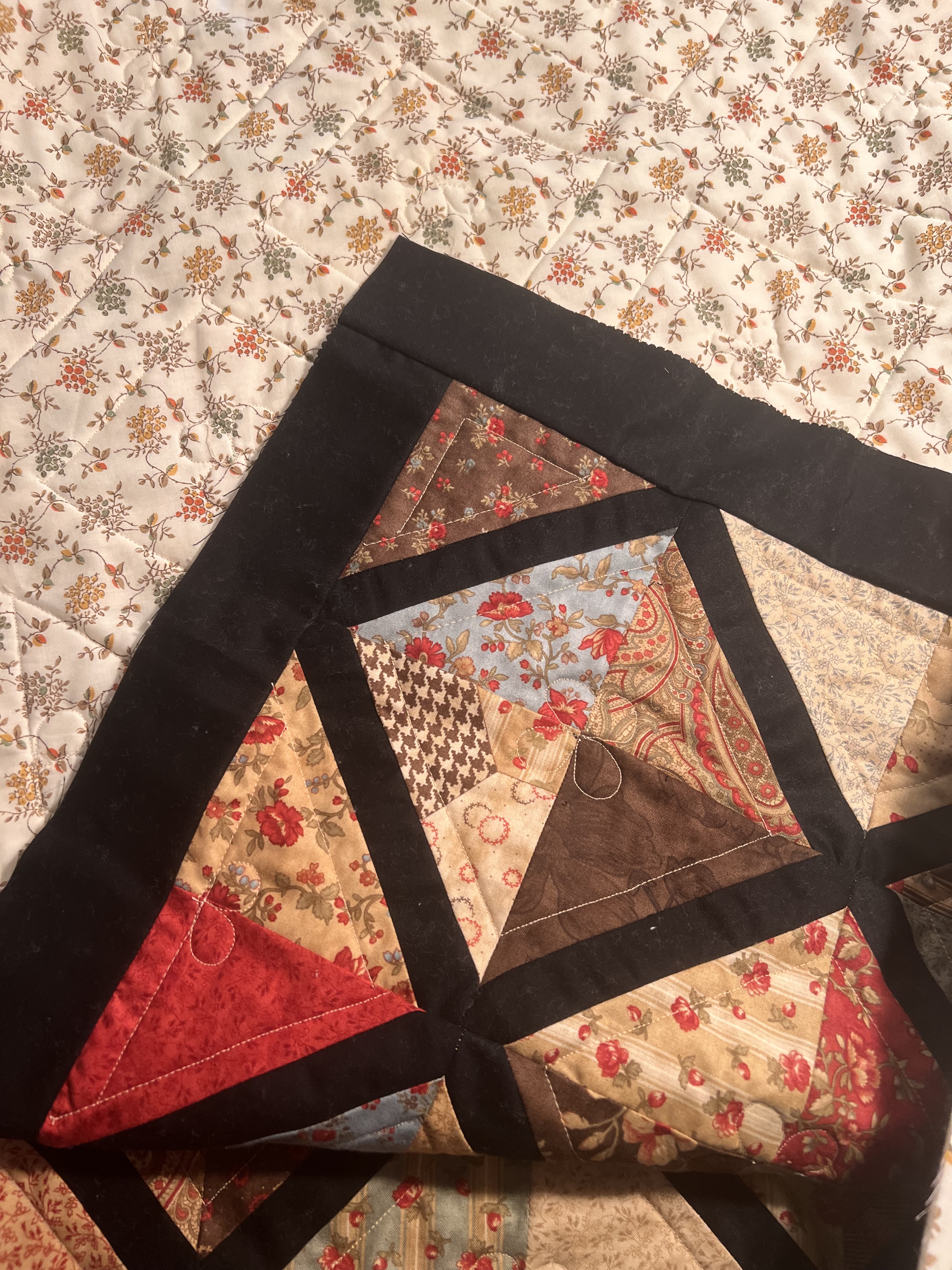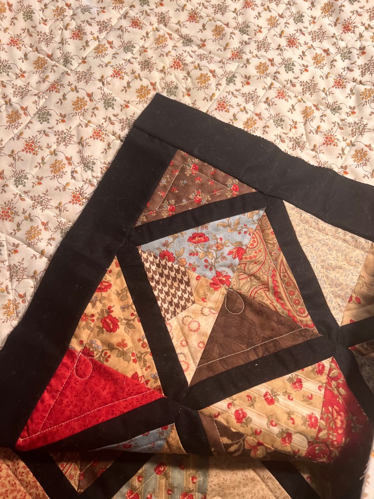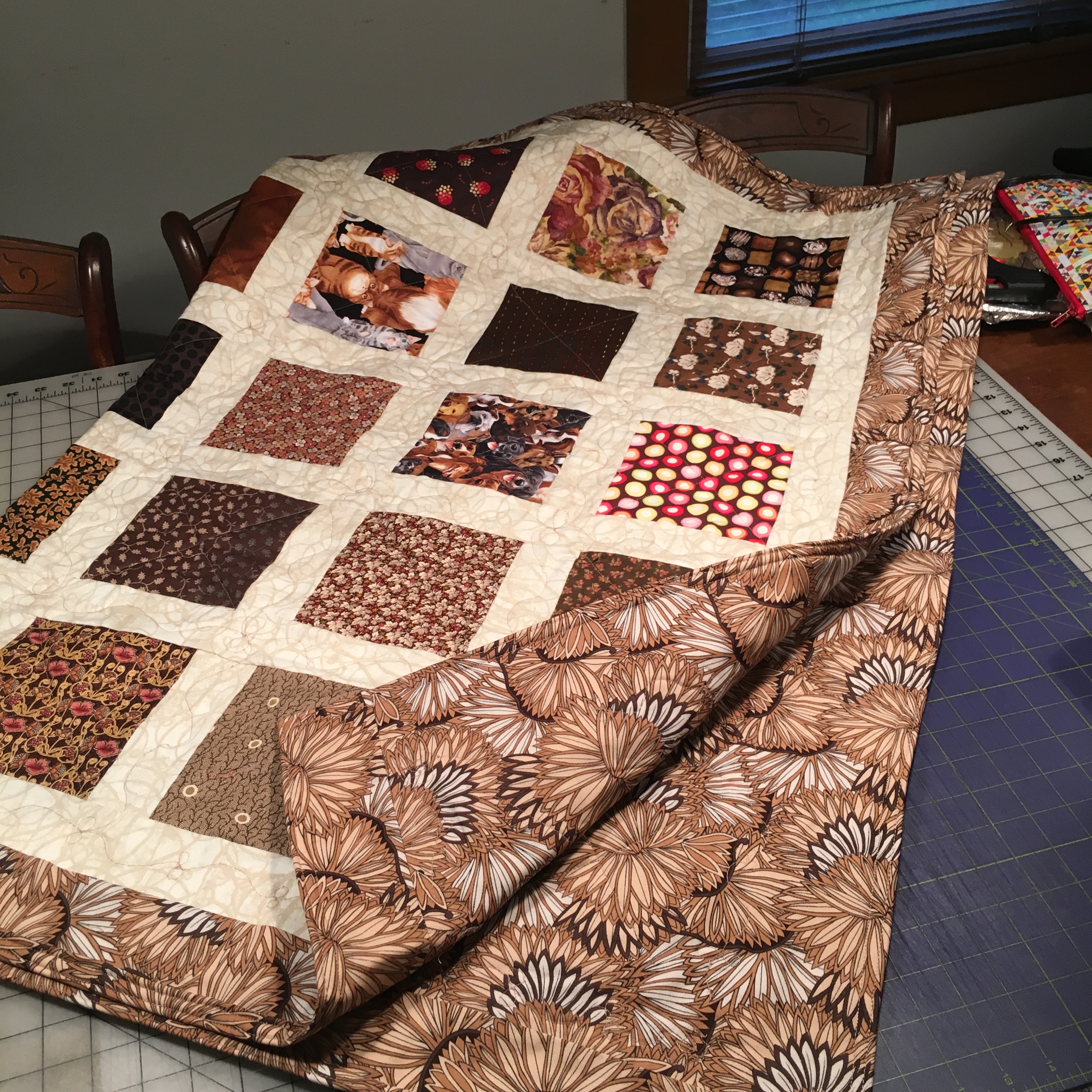 I had purchsed yardage of three scales of a brown gingham fabric on e-bay; they looked so appealing, but for years I didn’t know what to do with them. Finally, I bit the bullet, and decided to cut squares, tumblers and triangles, and see how they might fit together. By themselves, they had no life, so I pulled many brown prints from my stash, and added them to the mix. Now I had something I could work with. The soft, comfortable quilt that resulted is a quiet charmer.