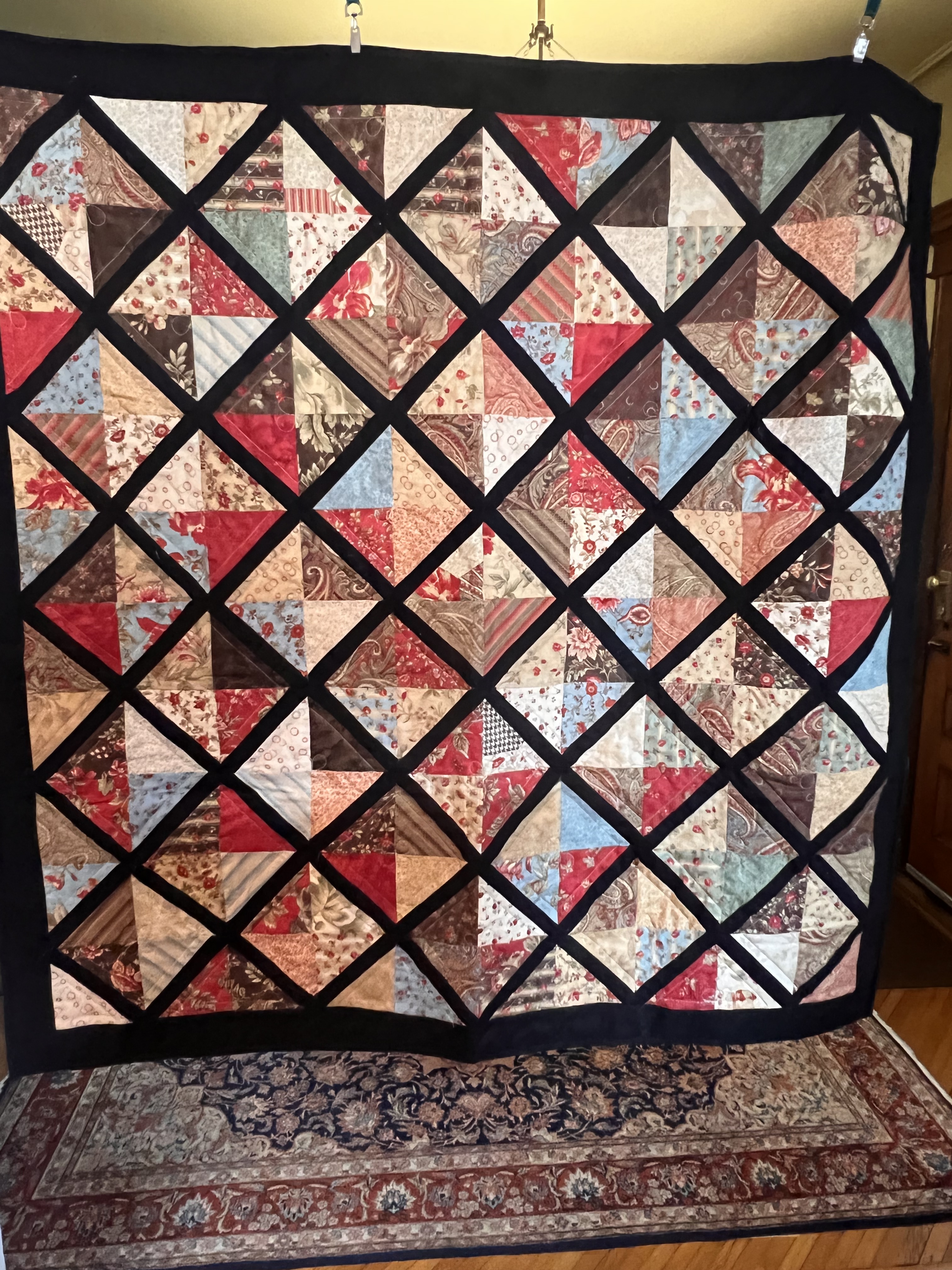 Our niece did a major remodel of her home, adding a new bedroom for herself. It cried out of a new quilt. A new technique of piecing the squares automatically embedded the black frame of the lattice. It creates the illusion of looking through a grill into a sweet garden.